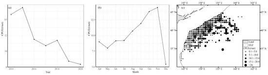 Spatiotemporal variation in (a) annual average CPUE, (b) average monthly CPUE, and (c) spatial distribution of average CPUE for chub mackerel from 2014 to 2019.