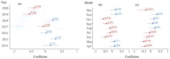 Slope and intercepts in random effects of Year and Month. (a) Random intercept in Year group. (b) Random slope of logCHL in Month group. (c) Random intercept in Month group (Values in blue font denote positive numbers, while those in red font signify negative numbers.).