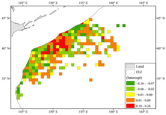 As shown in Figure 6, the random intercept in the Zone group ranged between −0.164 and 0.260 with an average value of 0.000 ± 0.066. It is worth noting that there was a region located between 150–152° E and 39–41°, with relatively high slope values, which was very different from the high CPUE distribution in Figure 4c. The average slope value in the region was 0.098 ± 0.069.