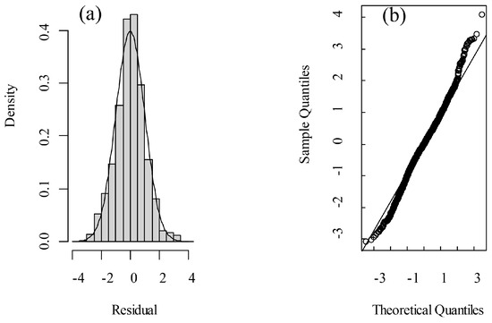 Normality assessment by (a) residual distribution and (b) Q-Q plot.