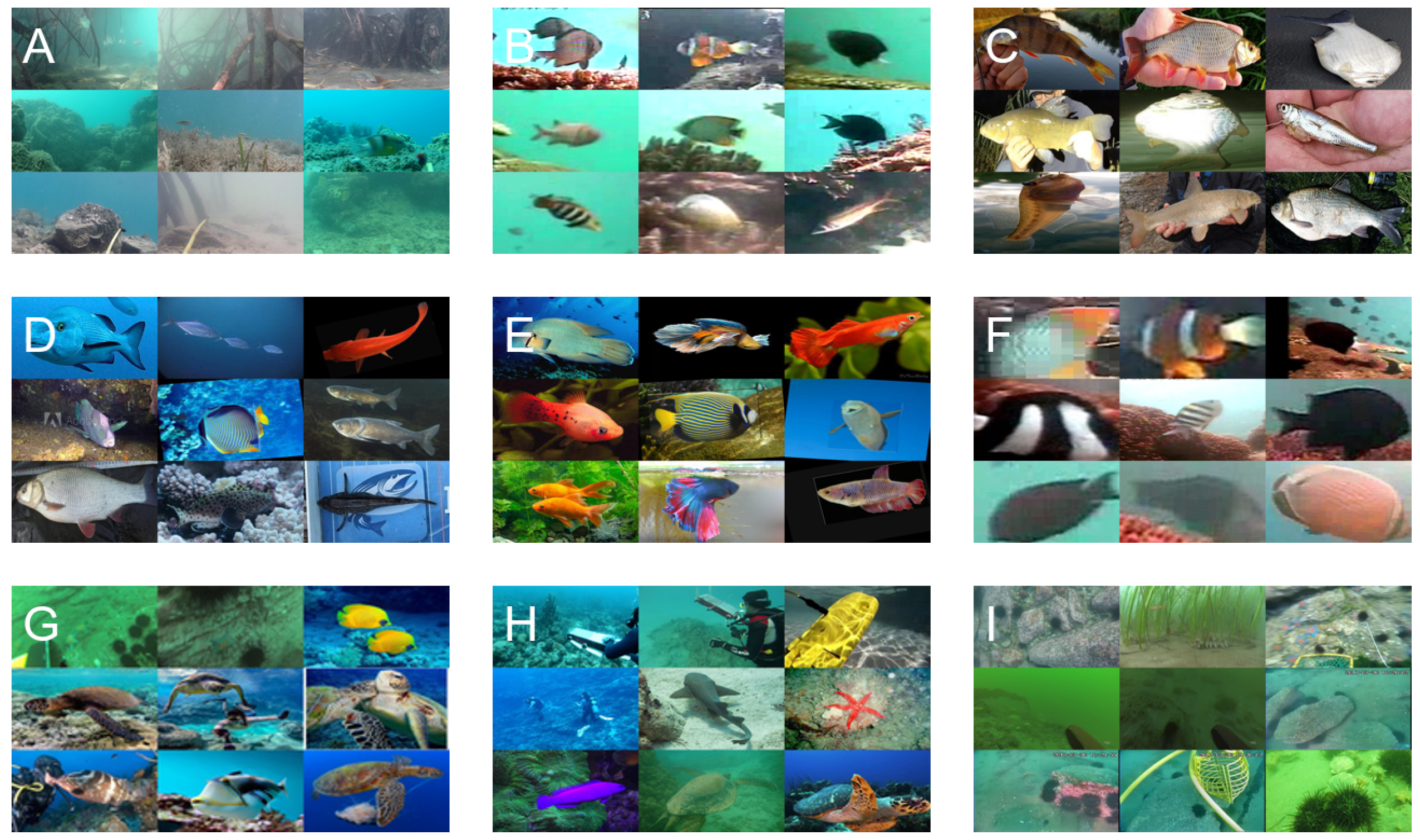 There is much relevant data, but various data sets are more or less flawed, such as DeepFish and Fish4Knowledge data sets, where the data size is large enough, but the label is not specific to fish categories but fish; the UTDAC, LifeCLEF, and SUIM data sets, which are also large enough to be labeled according to specific fish categories, but only have 4, 10, or 8 different species, with fewer target species, and cannot provide good classification results. Fish in the seagrass habitats data set meet the previous requirements, but its scenario is too simple and not the best choice. The above mentioned relevant data represent the legend in