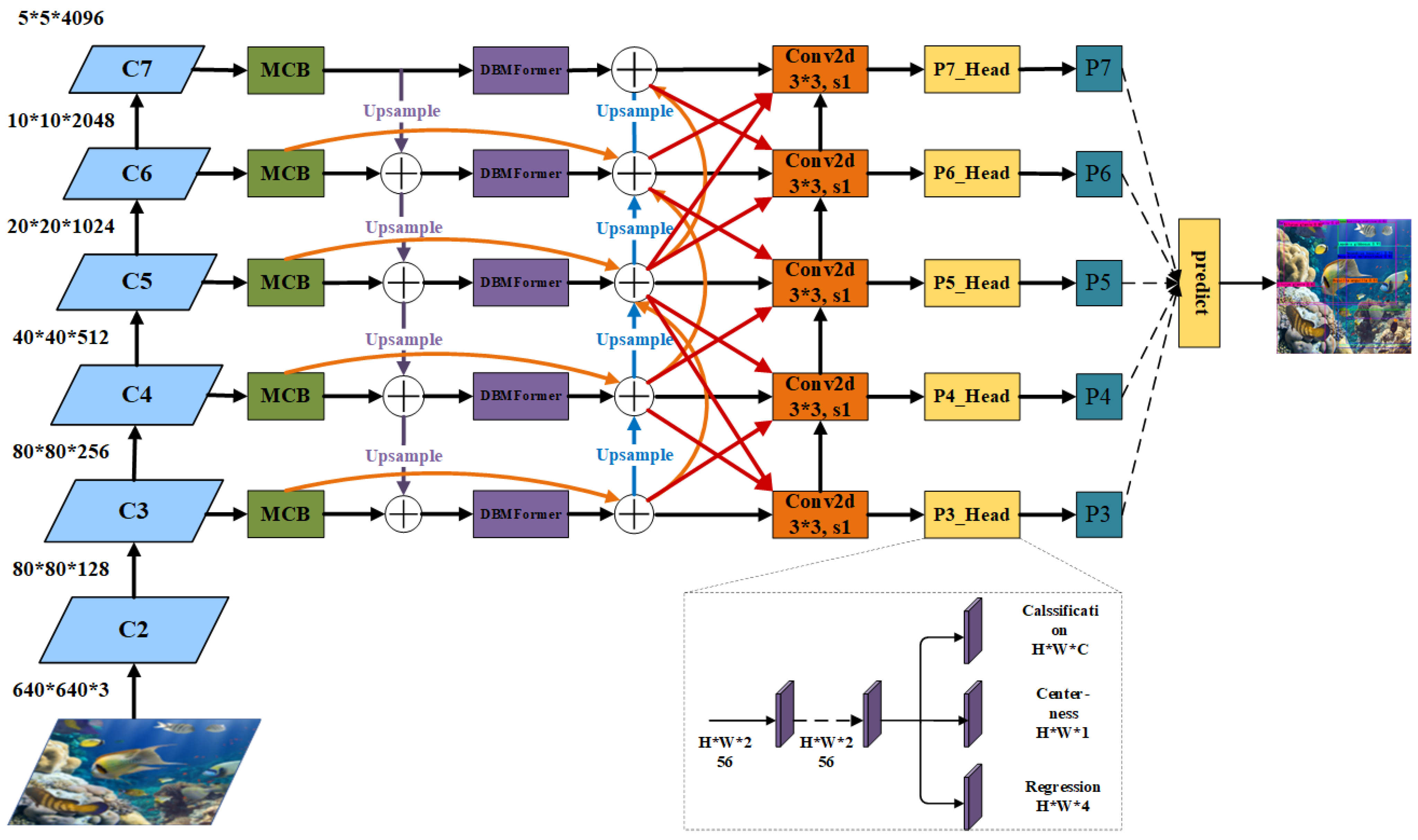 TMFD (triple the multi-scale/multi-layer/multi-stage fish detection) based on fish data images in different scenes. In view of the large differences in size and color of fish in multi-scene images, we deepened the depth of the model from the original three layers to the current five layers. Secondly, in the neck stage, in order to reduce the loss of a large number of high-dimensional features caused by direct use of the 1*1 convolution between the backbone and neck, we introduce the