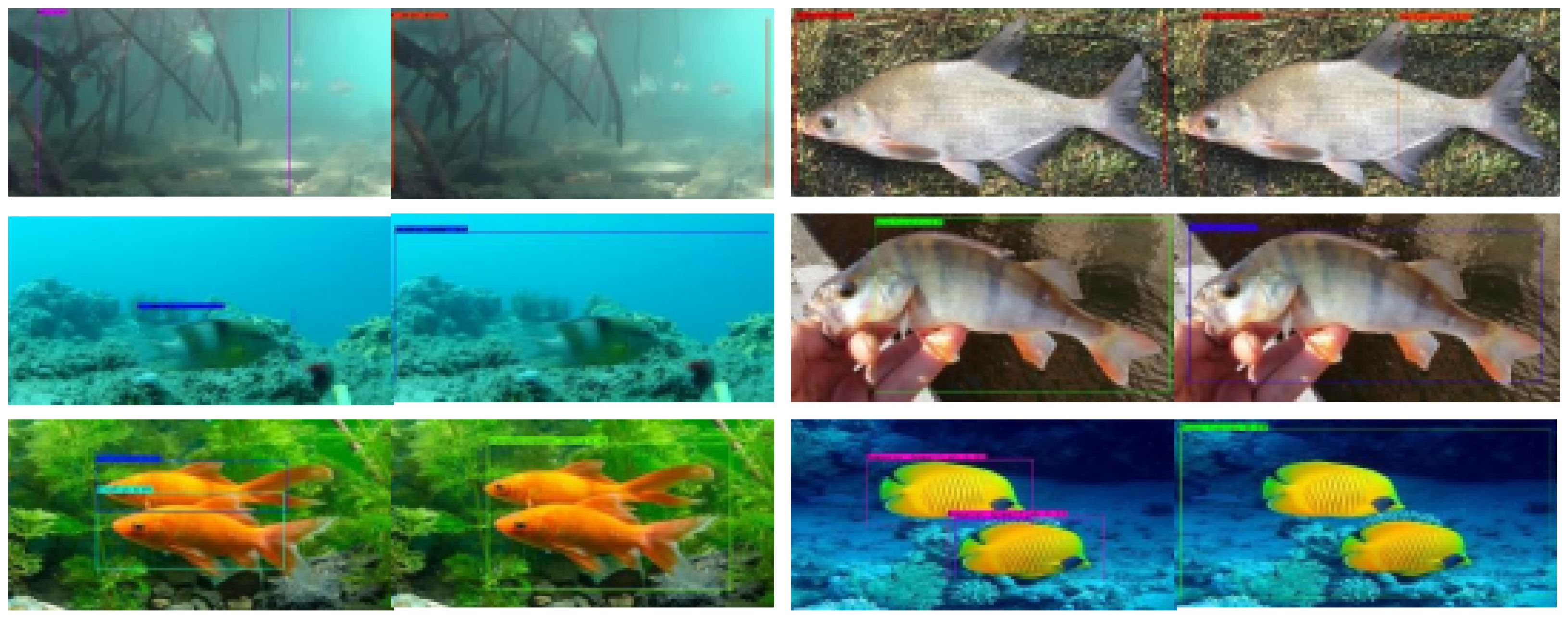 Figure 4. Data sets Fish52 and Lahatan are mainly used for comparative experiments to verify the effect of our model. These data sets are faced with such challenges as blurred pixels, too high a similarity between the foreground and background, fish species diversity, occlusion, a large difference in target size, etc. However, they also make up for the shortcomings of the aforementioned data sets. In order to further improve the quality of the data set, improve the training effect of the model, reduce the probability of overfitting, and improve the generalization ability of the model, we carried out a series of data enhancement operations on the data set, such as flipping, scaling, random noise, color transformation, Mosaic, etc.