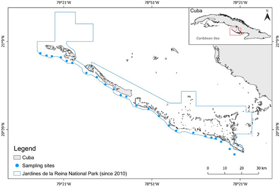 Cuba defines an MPA as a marine or coastal portion of outstanding natural value devoted to the protection and maintenance of biodiversity, natural resources, and cultural values associated with the natural environment [28]. The country has established important management measures to protect its marine and terrestrial biota and is leading the designation of marine protected areas (MPAs) in the Caribbean region, as it includes approximately 25% of its insular shelf in an MPA designation [29]. Despite these measures, and similarly to many other regions in the world, most Cuban MPAs are not efficiently studied, monitored, enforced, or financed [29,30]. Cuban MPAs have been chosen for their high conservation value, and are often multi-use. For example, Resolution 562 made commercial fishing in JRMR subject to consent by the Directorate of Fishing Regulations and prohibited sport and recreational fishing unless authorized by a special permit.