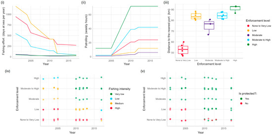The distribution of enforcement parameters over time and by enforcement level: None to Very Low (red), Low (orange), Moderate (purple), Moderate to High (blue), and High (green) for (i) fishing effort, (ii) patrolling effort, (iii) distance to the nearest fishing ports, (iv) fishing intensity, and (v) level of protection.