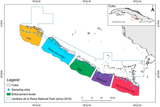 As fishery regulations have evolved in Cuba, implementation and compliance, and therefore, the enforcement of regulations, have varied spatially and temporally, including within the JRMR and across the JRNP, resulting in an enforcement gradient [35]. The delineation of the different levels of fishery management enforcement across the JRNP is quantified by five parameters that have been measured since 2001: patrolling effort, fishing effort, fishing intensity, distance to the nearest fishing port, and protection level within the national park (Tables S1–S4). Collectively, these parameters aid in quantitatively defining the level of enforcement in the JRNP, which are defined here as enforcement parameters. Fishing intensity is defined by the type of fishery (e.g., recreational vs. commercial) and abundance of vessels, and fishing effort is a running average of the days at sea per year. Patrolling effort is the number of hours spent patrolling per week and is estimated through interviews with fishery inspectors/park rangers, and the minimum distance to the main fishing ports on the mainland from sampling sites reflects the ease of access to the park. Protection level is either yes or no, dependent upon the determination of whether a site is included in a legally protected area.