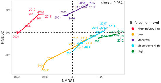 The transition in the enforcement gradient in space and time is apparent in the clustering of enforcement zones over time, as shown in the nmMDS (Figure 4). The highest levels of enforcement occur in the High-enforcement and Moderate- to High-enforcement levels, with the other zones on a trajectory toward transitioning to the higher levels of enforcement (Figure S1). Specifically, the Low-enforcement zone transitioned to the higher levels of enforcement, developing characteristics of the early stages of the zones with higher enforcement, indicating dynamic progression (Figure 4). The enforcement zones with the lowest levels of enforcement (None to Very Low) cluster with the Moderate-enforcement zone over time. Post-2010, the least enforced eastern zone (None to Very Low-enforcement) diverges: the far east maintains negligible enforcement, while the west adopts Low enforcement. This divergence is clearer in a non-grouped plot (Figure S1). Both plots use the same data, but the first omits extra labels and includes a trajectory path for clarity.