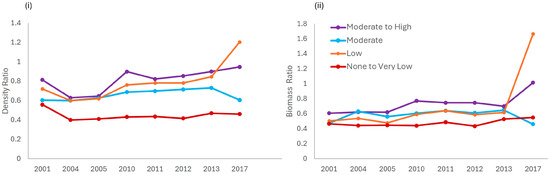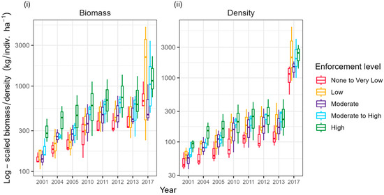 Comparison of the (i) density and (ii) biomass ratios across the enforcement gradient (None to Very Low, Low, Moderate, and Moderate-High) to the High-enforcement level, over time.