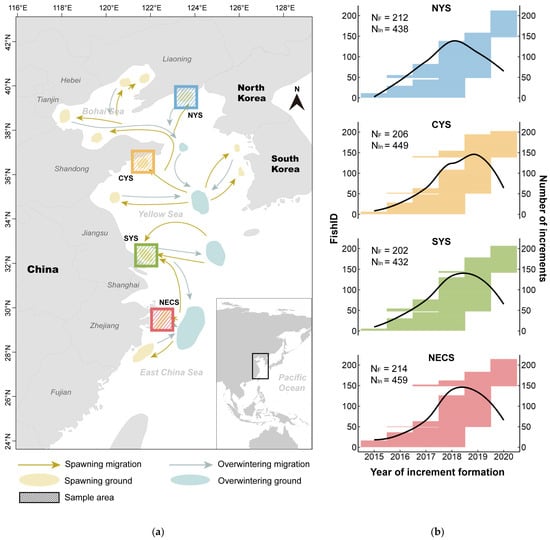Sampling information for the present study. (a) Map of the China Sea illustrating the migration routes of L. polyactis [,] and the four sampling areas: northern Yellow Sea (NYS), central Yellow Sea (CYS), southern Yellow Sea (SYS), and northern East China Sea (NECS). (b) Information on the increment data used in the analysis. The length of the horizontal line corresponding to each individual fish (FishID, the left y-axis; the FishID for small yellow croakers from each area has been simplified to numerical form) represents the span of years from the second to the last increments. The right y-axis indicates the cumulative count of otolith increments measured for each year, depicted by the black curve. The total number of fish individuals (NF) and the total number of increments (NIn) for each area are annotated, respectively.