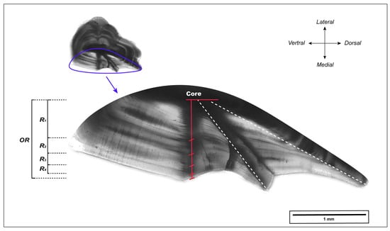 The right otolith was embedded in clear epoxy resin (EpoThin, Buehler Ltd., Shanghai, China). Then, a transverse section with a thickness of 0.8 mm was obtained by cutting through the center of the otolith along the dorsal–ventral axis [,] using an IsoMet low-speed saw (Buehler Ltd., Shanghai, China). Each section was mounted on a microscope slide and sequentially ground with waterproof abrasive paper of 240, 600, 1200, and 2500 grit to improve the visibility of annual marks. Subsequently, otolith sections were photographed at 40× magnification using an Olympus BX53 microscope with a DP74 digital camera (Olympus, Tokyo, Japan). Measurements of the otolith sections were performed using ImageJ software (version 1.53). Initially, the otolith radius (OR) was measured from the core to the edge along the axis on the medial side of the otolith (as shown in Figure 2). Annual growth increments, identified by alternating translucent and opaque bands, were then marked along the same axis, starting from the marginal increment corresponding to the year of capture and moving toward the otolith core. The age and increment estimation for each section was performed twice by an experienced otolith reader, blind to the fish information. In cases of inconsistency between the two age readings, a third reading was performed, or, if necessary, the sample was excluded.