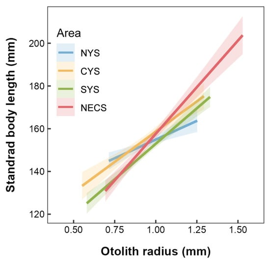 Linear relationships between standard body length and otolith radius for L. polyactis stocks sampled from the northern Yellow Sea (NYS), the central Yellow Sea (CYS), the southern Yellow Sea (SYS), and the northern East China Sea (NECS). The shaded areas denote the 95% confidence interval.