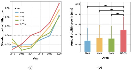 In this study, otolith increments aged 2–5 generated a biochronology covering the period from 2015 to 2020 for each stock. As predicted by BLUPs, the growth patterns indicated an overall increase in annual otolith growth of individuals, except for a decline observed between 2015 and 2016 in both the CYS and SYS stocks (Figure 4a). As for average annual otolith growth on the stock level, the NECS stock showed significant differences compared to the three stocks in the Yellow Sea, while no significant difference was observed among the latter three stocks (Figure 4b). Specifically, the individuals of the NECS stock exhibited the largest annual otolith growth, with those from the NYS, CYS, and SYS stocks being lower by 6.09%, 4.62%, and 4.91%, respectively.
