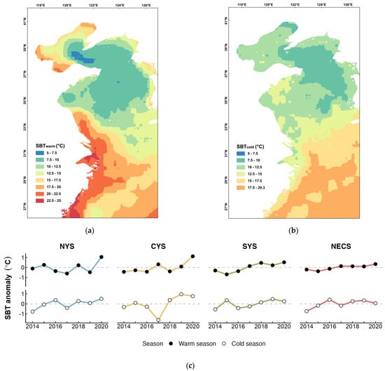 Spatio-temporal variation in sea bottom temperature (SBT) in study area during spawning season and overwintering season. (a) Average SBT distribution during warm season (May to Aug). (b) Average SBT distribution during cold season (Nov to Feb). (c) Inter-annual variations in the SBT of the spawning grounds and overwintering grounds for L. polyactis stocks in the northern Yellow Sea (NYS), the central Yellow Sea (CYS), the southern Yellow Sea (SYS), and the northern East China Sea (NECS).