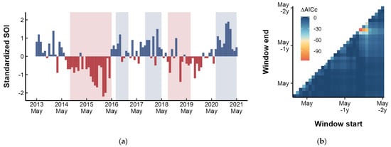 (a) Monthly standardized SOI values from 2013 to 2021, with shaded regions indicating warm (red) and cold (blue) phases as defined by ONI. (b) Results of optimal time window identification for SOI. ΔAICc (indicated by the gradient) are the differences in AICc between the alternative models and base model.