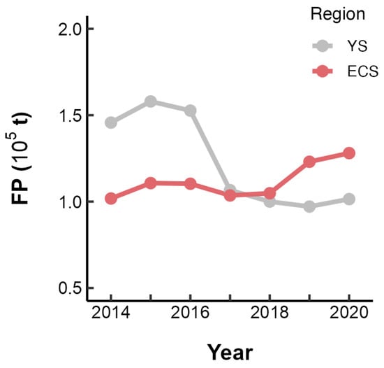 Annual variation in the fishing pressure (FP) on L. polyactis in the East China Sea (ECS) and Yellow Sea (YS).