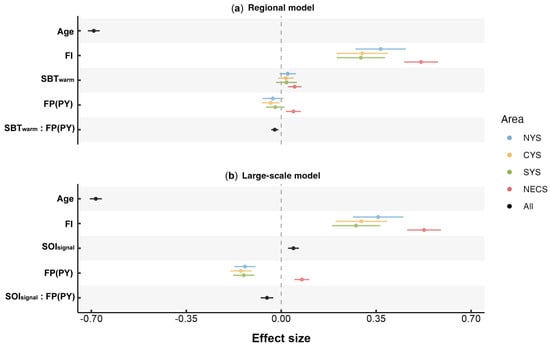 From 2014 to 2020, the fishing pressure on the stocks of small yellow croaker in the Yellow Sea exhibited a declining trend, while an upward trend was observed in the East China Sea (Figure 7). The model that included the previous year’s FP, with an interaction term Area, outperformed both the optimal intrinsic model and the one incorporating the current year’s FP, as indicated by a lower AICc value (Table 3). Subsequently, when the FP of the preceding year was integrated into the selected optimal SBT-only and SOI-only models, it was found that the models with the interaction between SBT/SOI and FP exhibited superior performance (Table 3).