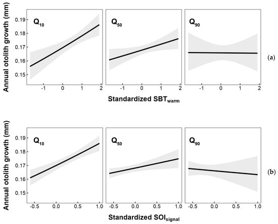 Annual otolith growth response to interaction between the previous year’s FP and (a) sea bottom temperature during warm season and (b) SOI signal selected by a sliding window analysis. Q10, Q50, and Q90 represent the 10th, 50th, and 90th percentiles of the observed annual FP on L. polyactis from 2014 to 2020. Shaded areas denote the 95% CI.
