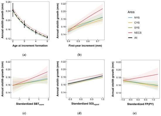 Area-specific annual otolith growth response to (a) age, (b) otolith growth of the first year after birth, (c) SBT (sea bottom temperature) during warm season, (d) SOI (Southern Oscillation Index) signal selected by sliding window analysis, and (e) FP (fishing pressure) in previous year. Shaded areas denote the 95% CI.