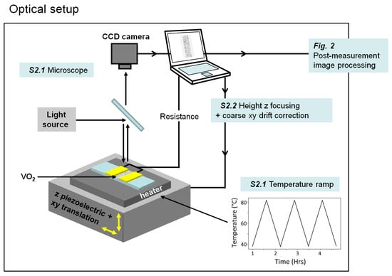 In order to achieve a technique that can track fine electronic cluster changes, we have developed a new optical full-field microscopy method that is able to map out in-focus, stabilized, highly contrasted 2D images of the electronic phases on the sample surface during the IMT. This insulator–metal domain imaging could be viewed as the equivalent of magnetic domain imaging techniques [23]. This method has already proven to be vital for tracking and understanding the encoding of memory in VO using ramp reversal temperature protocols [24], as well as for tracking criticality when analyzing fractal patterns through machine learning [25].