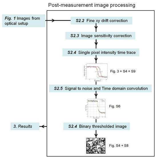 Schematics of the post measurement image analysis. Fine -plane drift correction (subpixel image stabilization [26]) was first performed (see SI Section S2.2). Camera sensitivity was normalized throughout the recording (see SI Section S2.3). After stabilization and intensity normalization, changes in each single pixel intensity due to the IMT can be tracked (see SI Section S2.4). Time domain convolution was applied to all time traces to reduce noise and pinpoint when each pixel changed (see SI Section S2.5). This threshold was used to generate binary black (metal)/white (insulator) images (see SI Section S2.4).