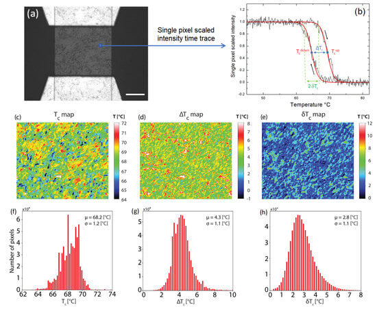(a) A 35 µm wide etched VO sample image with 30 µm separated gap gold leads (top and bottom). Sample temperature here is during the insulator (light gray) to metal (dark gray) transition (warming cycle). Scale bar is 10 µm. (b) Single pixel intensity curve defining the transition temperature T, hysteresis width T and transition width T. T were determined at midways as explained in the main text. Hysteresis width was determined by taking the temperature differences between heating and cooling cycles T − T. Transition width was determined by fitting (smooth curve) the single time trace to a hyperbolic tangent: ()−1). (c) Local transition temperature map, i.e., T map (upon warming), (d) T maps, (e) T map (upon warming). Images are 27.6 µm high. Histograms (with mean and standard deviation) of maps (a–c) are shown, respectively, in (f–h).