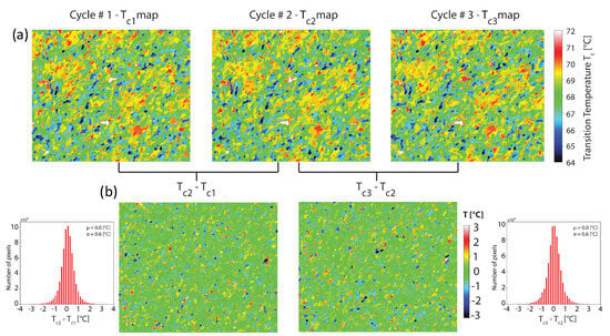 (a) Three T maps while cycling through the IMT (warming) at 1 °C/min. (b) Difference maps - and - between cycles. Global patterns are generally reproducible ( °C/68 °C ). However, some small regions present deviations up to ±2 °C. Full histograms (with mean and standard deviation) of each difference map are shown on the right and left. The difference map between T and T (the most separated, time-wise, temperature sweeps in this study) and the corresponding histogram are presented in SI Figure S7. Images are 33.6 µm × 27.6 µm.