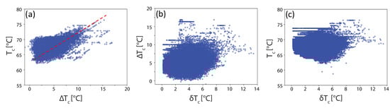 Pixels A and B show the most common type of local characteristics found in the maps: when T is high, T is high; when T is low, T is low. This positive correlation is evident at a global level in Figure 5a. However, on a local level, individual pixels can have a large deviation from the global average behavior. Indeed, pixel E shows a possibility of finding T very low (0.3 °C) with a T (66.3 °C) low but closer to the mean value of the map.