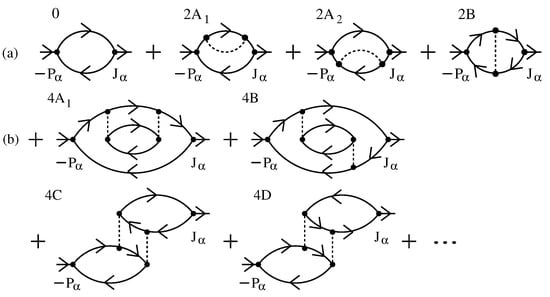 The right-hand-side expression in Equation (4) represents the high-energy expansion of the generalized Drude formula in powers of . The and contributions to can be represented by the Feynman diagrams shown in Figure 1a. They can be calculated either by using the usual finite-temperature perturbation theory [,] or by using the self-consistent RPA approach. In the Hartree–Fock scheme, the recollection of higher-order contributions to corresponds to the replacement of the bare electron propagators in the contributions by the renormalized propagators. This leads to
