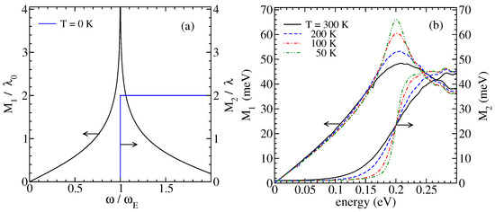 It is important first to recall that in this model the vertex contributions to vanish for symmetry reasons. The result for at is represented in Figure 2a by the unit step function. The threshold energy for the absorption of energy of external electromagnetic fields is associated with the creation of one optical phonon and one zero-energy electron–hole pair (see Figure 1a). The real part , obtained by the Kramers–Kronig transformation, is characterized by the singular behavior in the vicinity of the threshold energy, and it is linear in for frequencies well below .