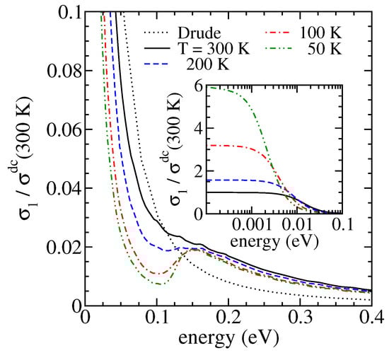 The real part of the intraband dynamical conductivity as a function of temperature calculated by using from Figure 3a. The dotted line is the ordinary Drude conductivity for meV.