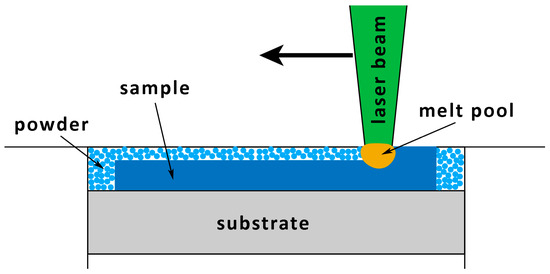 Among the AM techniques, LPBF is one of the most attractive for the production of fully dense metallic parts due to its high accuracy, the possibility of the fine-tuning of the process to adapt it to a wide range of materials, and the ability to synthesize items of almost any shape [15]. The LPBF process involves a series of steps, including powder layer deposition and laser scanning. It is conducted within an inert, controlled-atmosphere chamber to avoid oxidation during processing, i.e., melting and solidification, which is crucial when dealing with REM-containing materials. LPBF uses a high-energy laser beam to melt the metal powder completely along the laser path. By repeating this procedure and overlapping layer by layer, a three-dimensional component is formed. The layer-by-layer approach allows for complex structured and thin-walled components formation. Recycling the metallic powder increases the feedstock utilization rate and reduces the production cost. The laser interacts with the metallic powder to form a small molten pool on a scale of approximately 100 μm. The scheme diagram of the LPBF process is depicted in Figure 2. The cooling rates of the molten pool reach 104–106 K/s due to the high thermal gradients which occur during melting. Such rapid cooling rates inhibit grain growth and the segregation of the alloying elements. Together with the stirring action of Marangoni flow [19] in the molten pool, a fine microstructure that significantly influences the properties of the material is formed. The non-equilibrium solidification process increases the solid-solution limit of the alloy elements, and new metastable or even amorphous phases may occur. On the other hand, the large temperature gradients and complex heat transfer due to the cyclic processing of the laser beam usually result in the directional growth of grains, so the microstructure and properties of the alloy tend to be anisotropic. The high cooling rates lead to fine or even nanosized grain structure formation, which is favorable for high magnetic properties. The challenges of LPBF are structural defects such as porosity, cracks, shape distortions, and other defects which arise because of non-optimized process parameters, high residual stresses, and the high brittleness of the material.