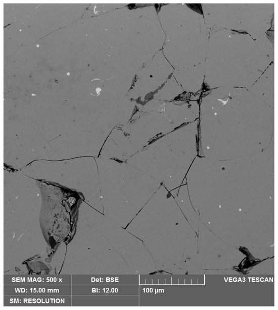 The magnetic properties of any permanent magnet material depend on its microstructure. As it was mentioned above, the LPBF method has its own characteristics, which affect microstructure formation: a short life-time of the molten state, high cooling and crystallization rates, etc. These peculiarities often lead to the formation of defects such as pores and cracks even in materials with high processability [83], and for REM-based intermetallic compounds, it is much more significant. In the case of structural material synthesis, the effect of defects on mechanical properties is usually investigated [84], whereas for NdFeB printing, the main problem of obtaining a fully dense material still remains, since it tends to crack and form pores and voids. The typical state of as-built samples synthesized by the authors from MQP-S alloy is shown in Figure 5. Lots of cracks and voids are seen, the formation of which is explained by the low processability of the material for LPBF (low mechanical properties, crystallization and phase composition peculiarities, etc.). Moreover, the microstructural analysis of Nd2Fe14B-based materials needs large volumes of experimental work along with high-precision equipment, so it is not surprising that some studies contain descriptions of only synthesis procedures and magnetic properties without microstructural analyses [60,74]