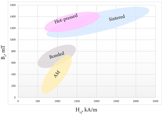 Conventionally, magnet production is realized by the powder metallurgical route, consisting of powder fabrication, pressing and magnetic field alignment, sintering, and post-sintering heat treatment [90]. A comparison of the extrinsic properties of magnets obtained by different methods is illustrated in Table 3. The maximum energy product is achieved by the conventional method of sintering. Hot-pressed magnetoplasts obtain a lower energy product but are easily treated and cheaper then sintered magnets. Hot-pressed magnetoplasts can replace sintered magnets in spheres, where high coercive force and energy product are not obligatory, magnetic separators, generators, sensors, etc. Bonded magnetoplasts, a kind of new-generation composite material made from permanent magnetic powder and plastic, have outstanding magnetic properties and plastic properties and feature high precision and exceptional shock resistance. Unlike NdFeB bonded compressed magnets, bonded magnetoplast NdFeB magnets can be processed into various components with complicated shapes, allowing the magnets to be used within more complicated applications. The additive manufacturing of NdFeB offers an opportunity to produce components of complex geometry, efficiently use material, and specifically tailor properties. As is seen from Table 3 and the diagram in Figure 6, AM magnets obtain lower energy product and residual induction and are still being investigated in laboratories.