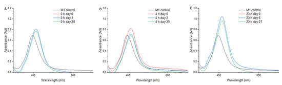 Figure 3 presents the UV/Vis spectra from 300 to 700 nm of AgNPs subjected to a pressure of 1.75 MPa for 0, 4, and 23 h. Upon treatment for 0 h (Figure 3A), the AgNPs exhibited a maximum absorbance of 0.813 at 414 nm, showing an SPR shift of +18 nm. The measurement of SPR at one day and at 28 days after treatment showed no significant changes in the SPR. In the 4-h treatment (Figure 3B), a maximum absorbance of 0.825 at 414 nm was observed, and a decrease in the SPR intensity was found two days after pressure treatment. In the 23-h treatment (Figure 3C), an SPR shift of +19 nm and an increase in the plasmon peak intensity were found.