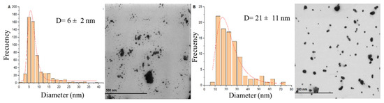 STEM images of AgNPs synthetized with the two synthesis methods are presented in Figure 4. Figure 4A presents the AgNPs synthetized with Method 1, showing spherical morphologies with a diameter distribution of 6 ± 2 nm. Figure 4B presents the AgNPs synthetized with Method 2, which presents a diameter distribution of 21 ± 11 nm. AgNPs synthesized with Method 1 at pH 10.0 resulted in particles with spherical morphologies at a submicrometric scale with a diameter distribution of 300 ± 84 nm.