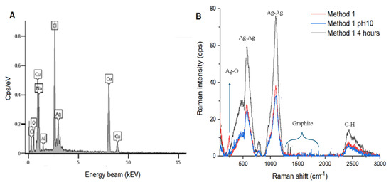 Determination of elemental composition and chemical structure of AgNPs synthetized by Method 1 EDX (A) and Raman (B) techniques.