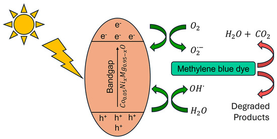 The photocatalytic mechanism of Co0.05NixMg0.95−xO NPs is shown in Figure 3. With sunlight exposure, electrons (e−) in the valence band (VB) are excited to the conduction band (CB). The generated electron and hole pairs are separated due to the presence of Ni and Co dopants that act as trapping centers in the bandgap and result in suppressing the electron hole recombination [12]. The excited electrons react with adsorbed oxygen molecules and reduce them to superoxide radicals. In addition, holes react with water molecules and generate hydroxyl radicals. These superoxide and hydroxyl radicals actively participate in the degradation of MB. The following chemical reactions are involved in the photocatalytic activity of Co0.05NixMg0.95−xO NPs [41,42,43].