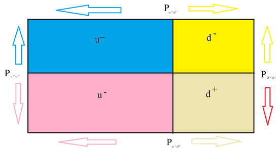 In [4], the wave-functions related to the paths crossing the intersection point P were defined as (Overlapping) for the electron and the positron, respectively. In the same way, (Non-overlapping) represents the wave-functions corresponding to the paths that never cross the point P for both the electron and the positron, respectively. These states appear after the initial wave-function departing from the lines and in Figure 1 cross through the initial beam splitters . The second beam splitter defines the post-selected state in [4]. When the initial state crosses , the state of the electron–positron pair is defined as