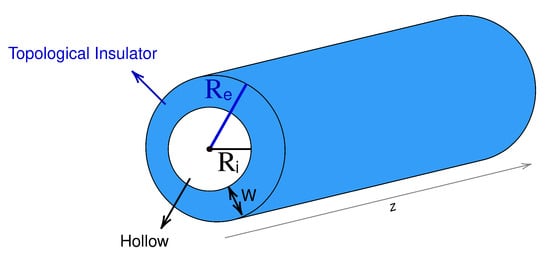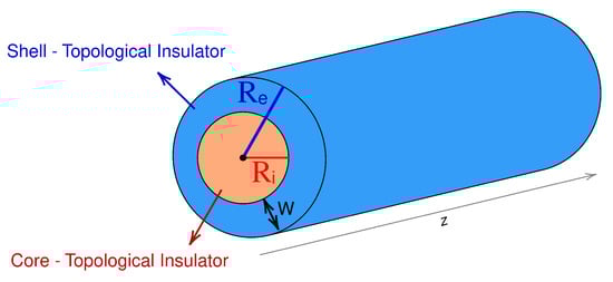 In this section, we consider a system composed of two topological insulators arranged in a cylindrical coaxial geometry, as illustrated in Figure 1. To model this kind of system, we use the hard-wall approximation; i.e., we assume that the parameters of the Hamiltonian in Equation (2), such as or , depend on the position. So, for a core–shell cylinder with a core made of and shell made of , we get that