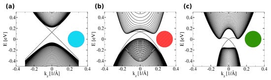 Another feature that it is necessary to analyze carefully is the bundles of eigenvalues that appear on the sides of the conduction or valence bands; see, for instance, Figure 4d,f. In the case of panel (d), the bundles appear at the sides of the valence band while, in the case of panel (f), they appear at the sides of the conduction band. For the case shown, the bundles are composed of exactly ten eigenvalues; that is, the number of different angular momenta used to obtain the spectra. So, in the limit , these bundles should form a single band. In the cases shown in panels (d) and (e), the valence and conduction bands would overlap, completely changing the behavior of the material. On the other hand, the patterns observed in the interior of the valence and conduction bands are the result of the presence of sub-bands with different symmetries.
