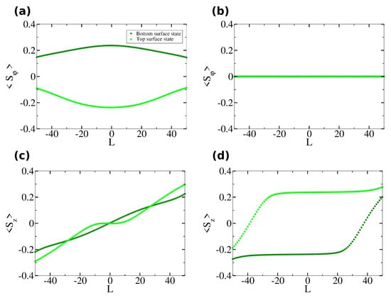 Spin orientations as a function of angular momentum L for a solid cylinder made entirely of with radius . Panel (a) shows the expectation value of the azimuthal spin component at ; panel (b) shows at ; panel (c) shows the expectation value of the z-component at ; and panel (d) shows at . The lowest-energy surface state is shown in dark green, while the highest-energy surface state is shown in light green.