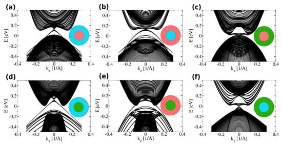 Energy spectra as a function of the wavevector component along the cylinder axis, , for concentric cylindrical heterostructures composed of two topological insulators. In each panel we include eigenvalues calculated using the first ten angular momentum values . Each panel corresponds to a different core–shell material combination, with the core located at the center and the shell surrounding it. (a) core and shell; (b) core and shell; (c) core and shell; (d) core and shell; (e) core and shell; (f) core and shell. A transverse cross-section is shown in each case, with color coding used to distinguish the materials.
