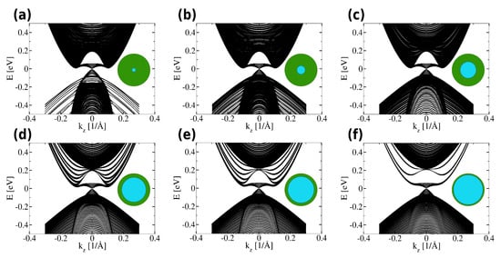 Energy spectra as a function of the z-component of the wavevector, , for cylindrical core–shell structures composed of as the core and as the shell, with varying core radii. The spectra are shown for 10 different angular momentum values. Panels (a–f) correspond to increasing inner radii , given as a percentage of the outer radius : (a) ; (b) ; (c) ; (d) ; (e) ; (f) . The core–shell geometry for each configuration is illustrated with an inset image in each panel.