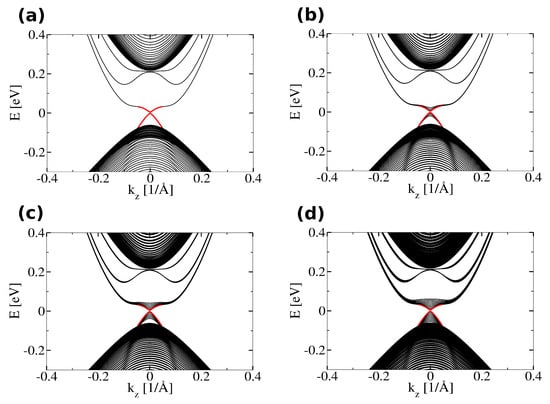 To further clarify how the spectrum of a given heretostructure is built up when adding more and more eigenvalues corresponding to distinct values of the angular momentum, Figure 6 presents the eigenvalues calculated for (a) ; (b) and 4; (c) ; and (d) . It is easy to appreciate that the topological states correspond to those eigenvalues that accumulate near the highest and lowest eigenvalues (with ) for the valence and conduction band, respectively. It is also appreciable that the bundles of eigenvalues at the sides of the conduction band are not part of the topological states.