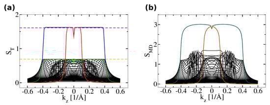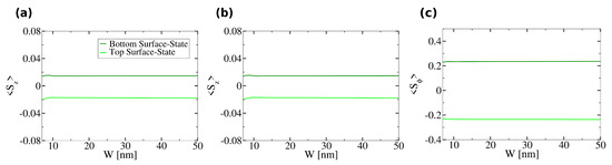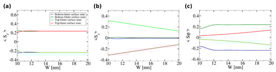 In Section 3.1, we used the expectation values of the spin operators and for different values of the angular momentum number L to provide evidence for the chiral character of the topological eigenstates, and to determine the relationship between angular momentum and the polarization in the z-direction; see Figure 3. In Figure 7, we plot the expectation values of the same spin operators as functions of the shell width, , for two different values of the wave vector . Interestingly, for small values of the width, nm, the expectation values are independent of the width, indicating that the properties of the topological states localized near the exterior border of the cylinder do not change too much unless the width is comparable to the localization length.