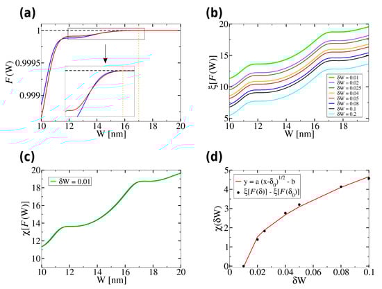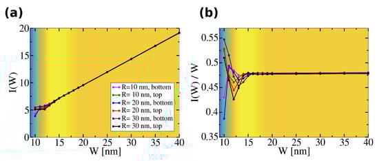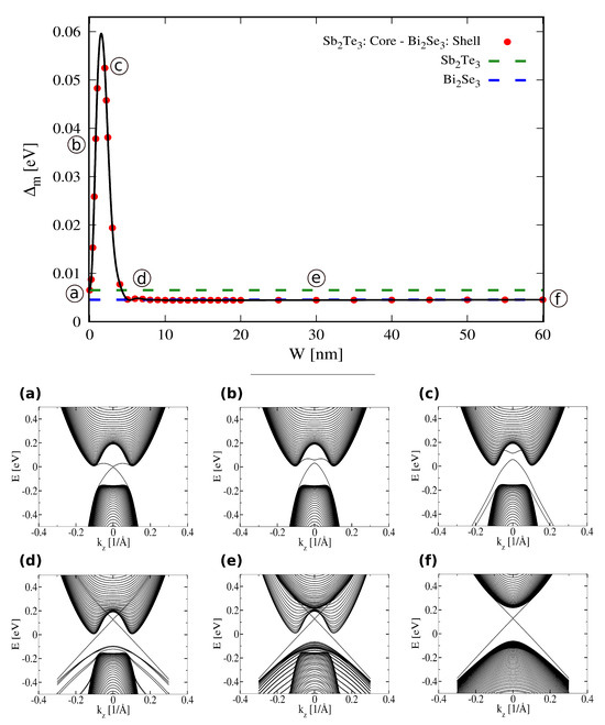 Other quantities also contribute evidence that the topological states near the surface of the cylinder do not change considerably, despite the core–shell structure. In Figure 8, we plot the energy gap that separates the lowest and highest topological states on the conduction and valence bands, respectively. Along the solid black line—which corresponds to the gap between edge states of a cylinder with in the core and in the shell—letters show to which spectrum points on the plot correspond. Again, for a small range below nm, the energy gap is generally independent of W.