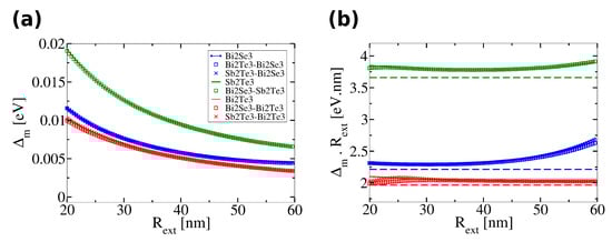 (a) Energy gap as a function of the outer radius for cylindrical core–shell structures with different material combinations in the core and shell. Each of the three sets of curves is represented by a different color, corresponding to a specific pair of topological insulators. The gap is evaluated at , using a truncated basis of states and angular momentum . One material combination is omitted for clarity. (b) Scaled energy gaps as a function of . The dashed lines correspond to the analytical expression for the azimuthal Fermi velocity, (according to Ref. [19]), using the same color code as in panel (a) for each material combination. This comparison illustrates the asymptotic agreement between the numerically computed gaps and the effective surface-state velocity in the large-radius limit.