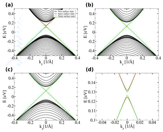 As a first step toward understanding the electronic properties of cylindrical core–shell nanostructures, we begin by analyzing systems composed entirely of a single topological insulator with a uniform cylindrical geometry. The image in Figure 1 depicts a nanowire with a core–shell structure. In this subsection, we consider a nanowire without an external shell; i.e., .
