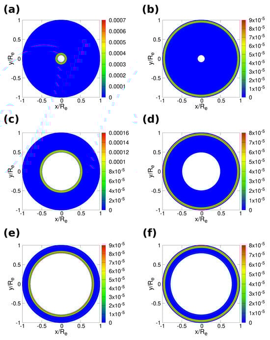 The probability density function allows for a better appreciation of the spatial extent of the helical states whose energy lies on the bulk gap. Figure A1 illustrates how the probability density of the topological states behaves within the shell region. As expected, the probability density vanishes at the cylinder boundaries and , consistent with the imposed homogeneous boundary conditions.