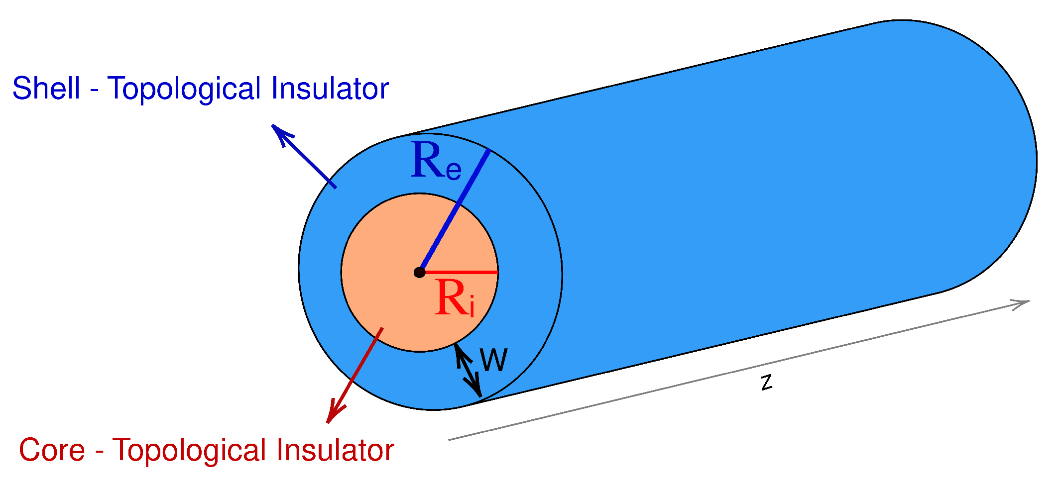 Figure 1. Schematic representation of a concentric cylindrical structure composed of two topological insulators. The axial direction of the cylinder extends along the z-axis. The outer (shell) topological insulator is shown in blue, and the inner (core) topological insulator is shown in red. The external radius R e is indicated with a blue arrow, the internal radius R i with a red arrow, and the shell width W = R e R i with a black double arrow. The characteristic dimensions of R i and R e are on the order of tens of nanometers.
